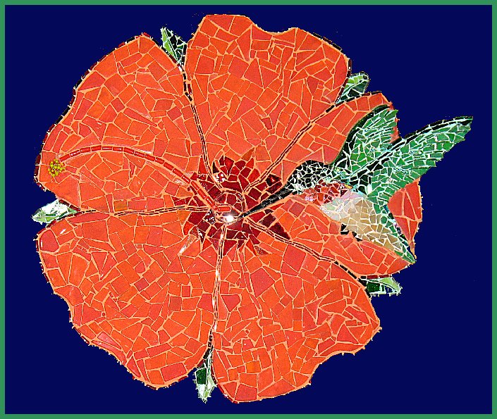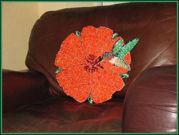 A plaque of a beautiful hibiscus flower with an irridescent hummingbird all created in mosaics. Made by mosaic Artist, Jane Rye.